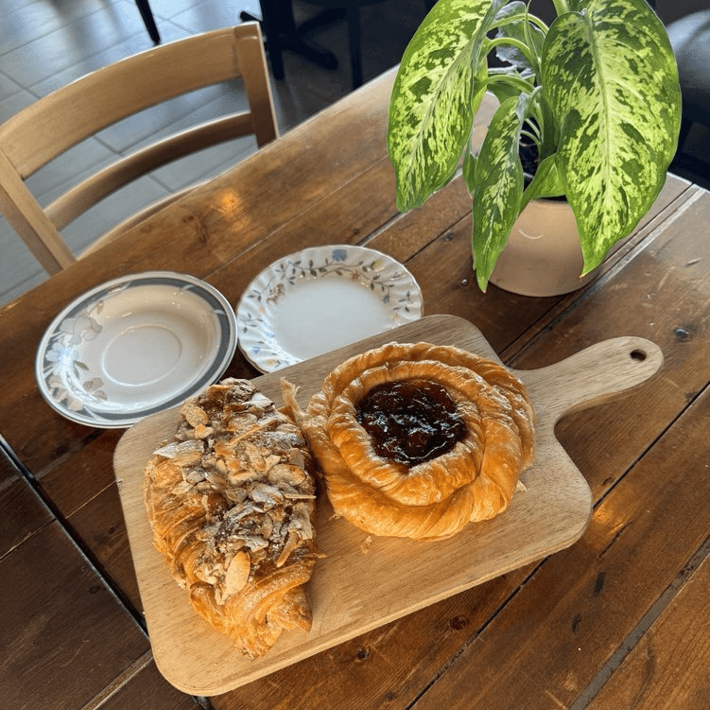 This is a new cafe that opened near my job. The woman who works there is very friendly, and the atmosphere is so peaceful. The decorations really bring the place together, too. I got the almond croissant, and it was delicious!